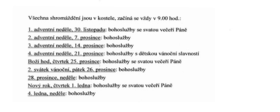 | So 25.12. 2021 | Narození Páně | v 8:30 hod. bohoslužby v kostele s vysluhováním Večeře Páně – káže Libor Chaloupka |