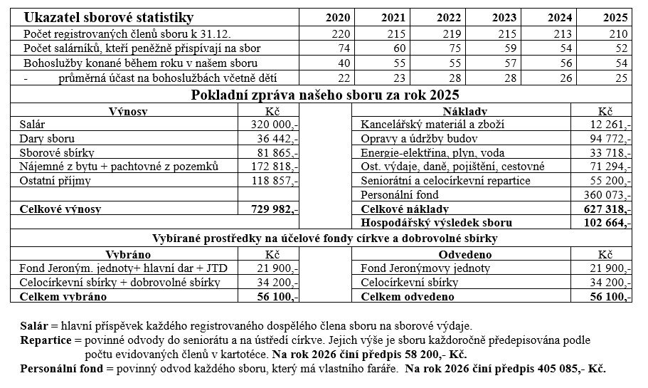 Jako každý rok prosíme členy sboru, aby svoje členství nebrali pouze jako formalitu, ale osobní i finanční pomocí aktivně svůj sbor podporovali. Podle evidence by sboru mělo finančně přispívat 190 jeho členů (nepočítáme studenty a děti). V celé naší církvi platí doporučení, aby její členové odevzdávali sboru pět procent ze svého čistého příjmu. Vězte, že i menší částka než tato doporučená bude pro sbor přínosem a pomocí. Peníze můžete posílat bankovním příkazem na sborový účet 103419488/0300, nebo je odevzdat v hotovosti po bohoslužbách. Několik členů sboru využívá trvalý bankovní příkaz k pravidelným měsíčním platbám. Ke každému daru bude vystaveno potvrzení pro účely odpočtu na dani z příjmů.